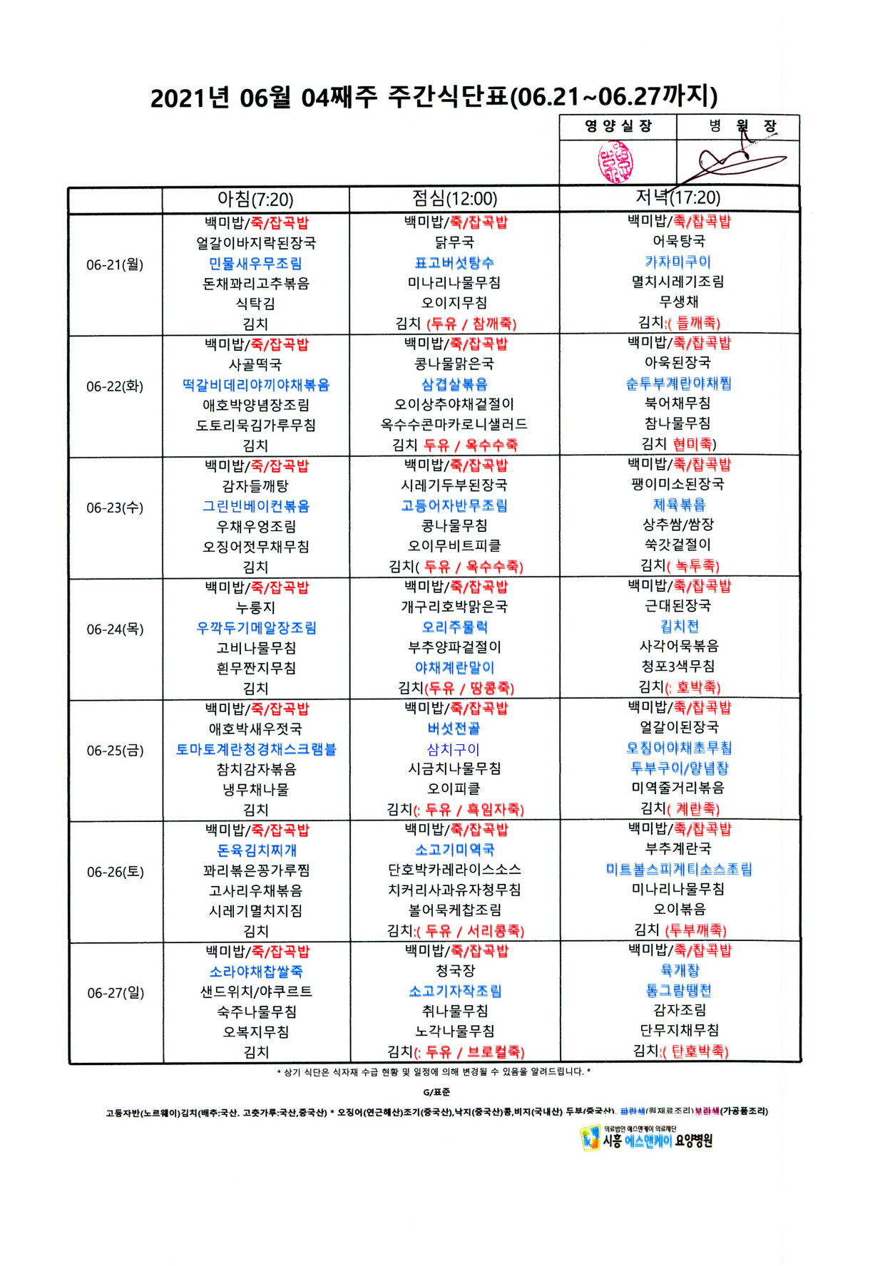 2021년 6월 4째주 주간식단표