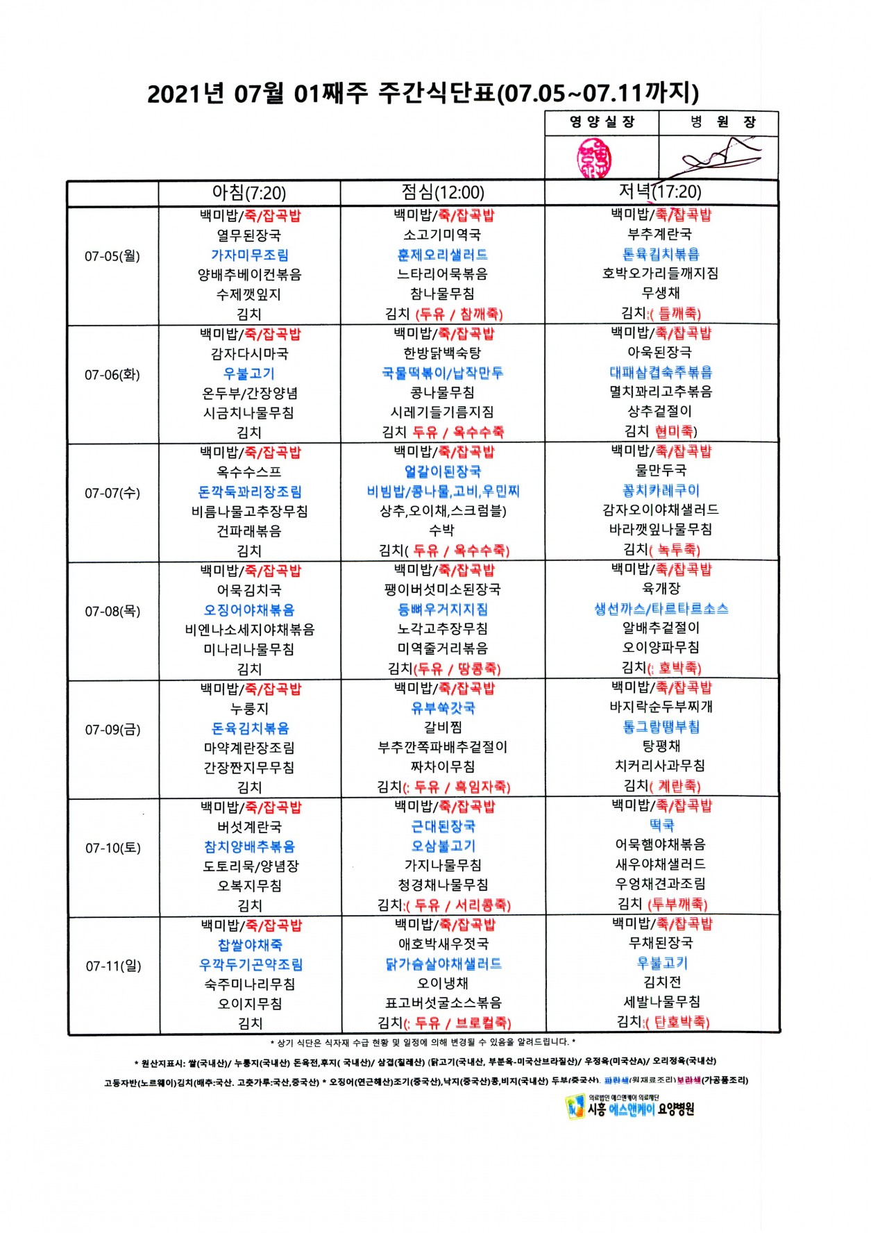 2021년 7월 1째주 주간식단표