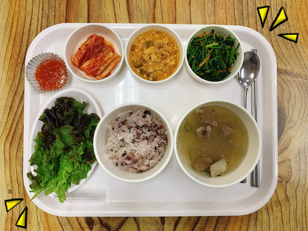 금일 중식 식단은 백미밥(죽/잡곡밥) / 소고기당면국 / 우렁강된장 / 양상추쌈&쌈장 / 참나물무침 / 김치 였습니다~!