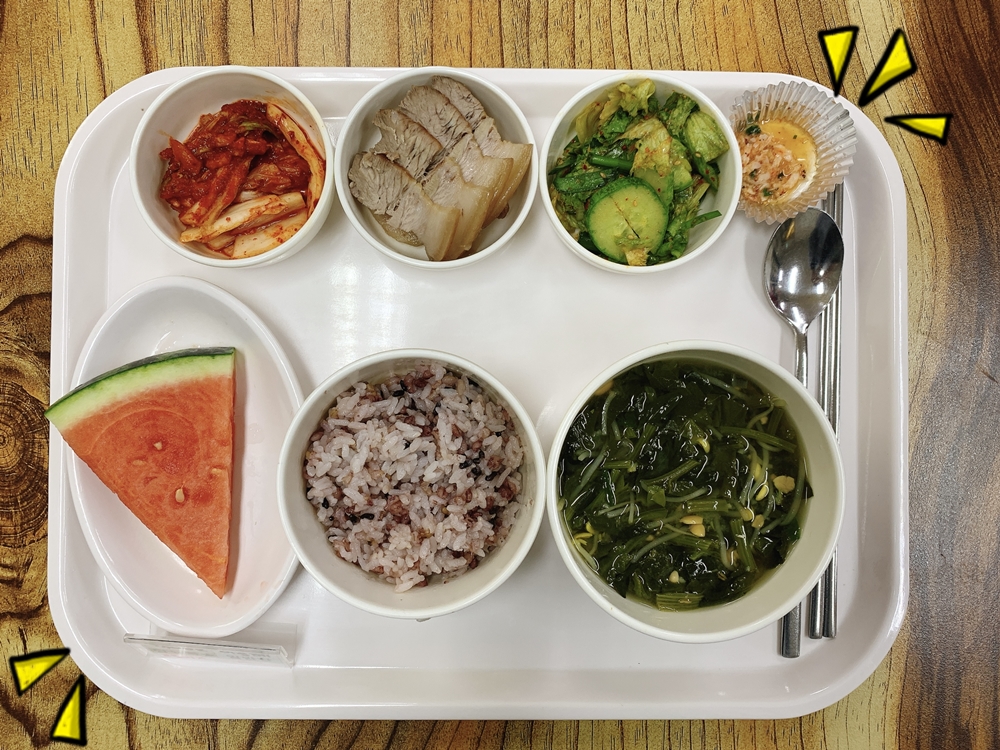 금일 중식 식단은 백미밥(죽/잡곡밥) / 시금치콩나물된장국 / 돈수육&새우젓 / 상추오이겉절이 / 수박 / 김치&열무김치 였습니다~!
