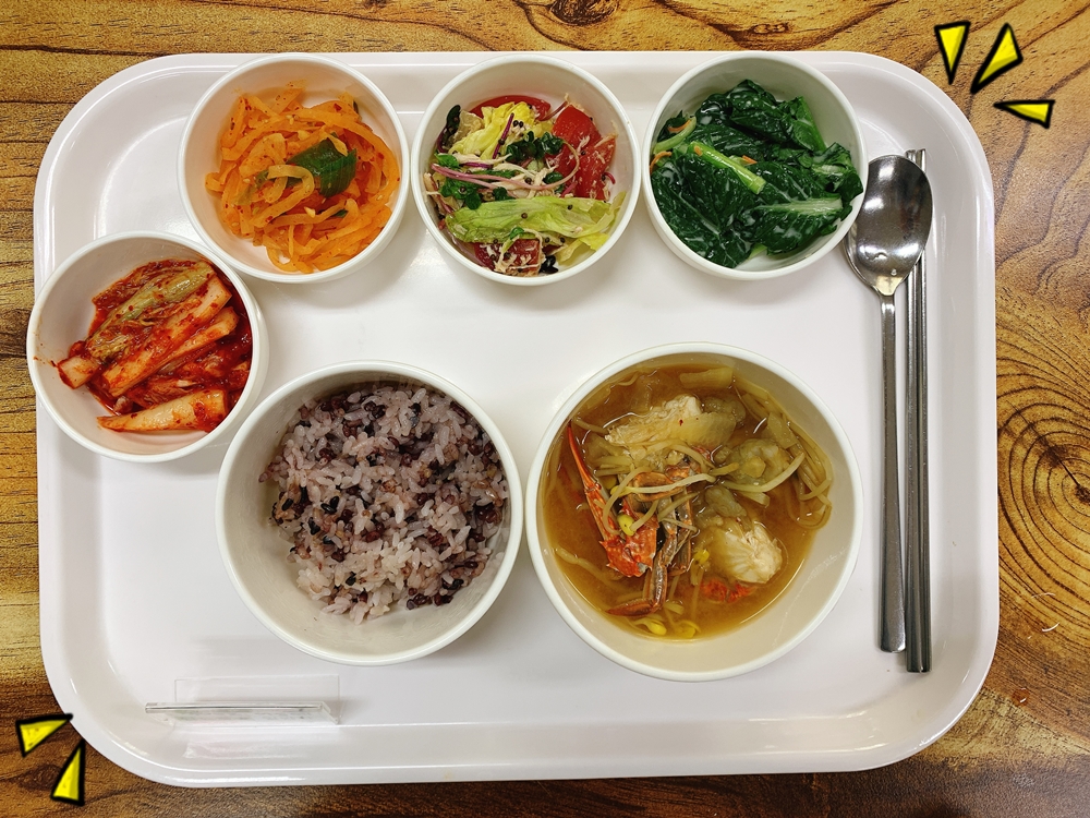 금일 중식 식단은 백미밥(죽/잡곡밥) / 꽃게탕 / 닭가슴살토마토샐러드 / 비타민파인소스무침 / 흰짠지무무침 / 김치 였습니다~!