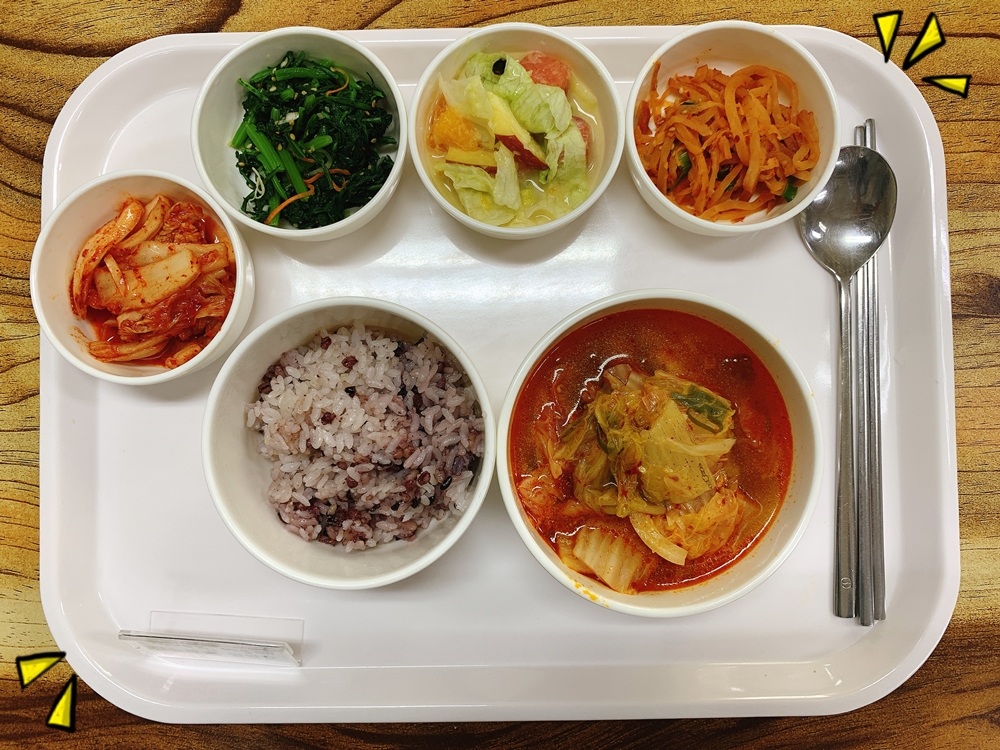 금일 중식 식단은 백미밥(죽/잡곡밥) / 돈등갈비지짐 / 양상추과일샐러드 / 쑥갓나물무침 / 간장짠지무무침 / 김치 였습니다~!