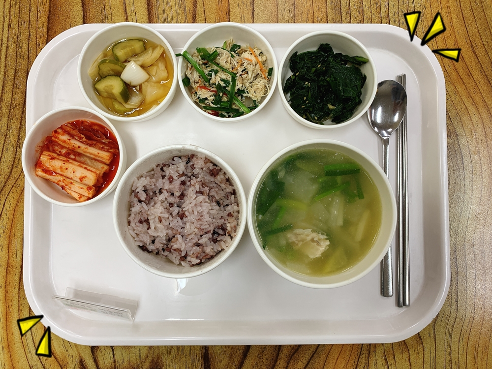금일 중식 식단은 백미밥(죽/잡곡밥) / 닭국 / 닭무침 / 바라깻잎나물무침 / 오이양파피클 / 김치 였습니다~!