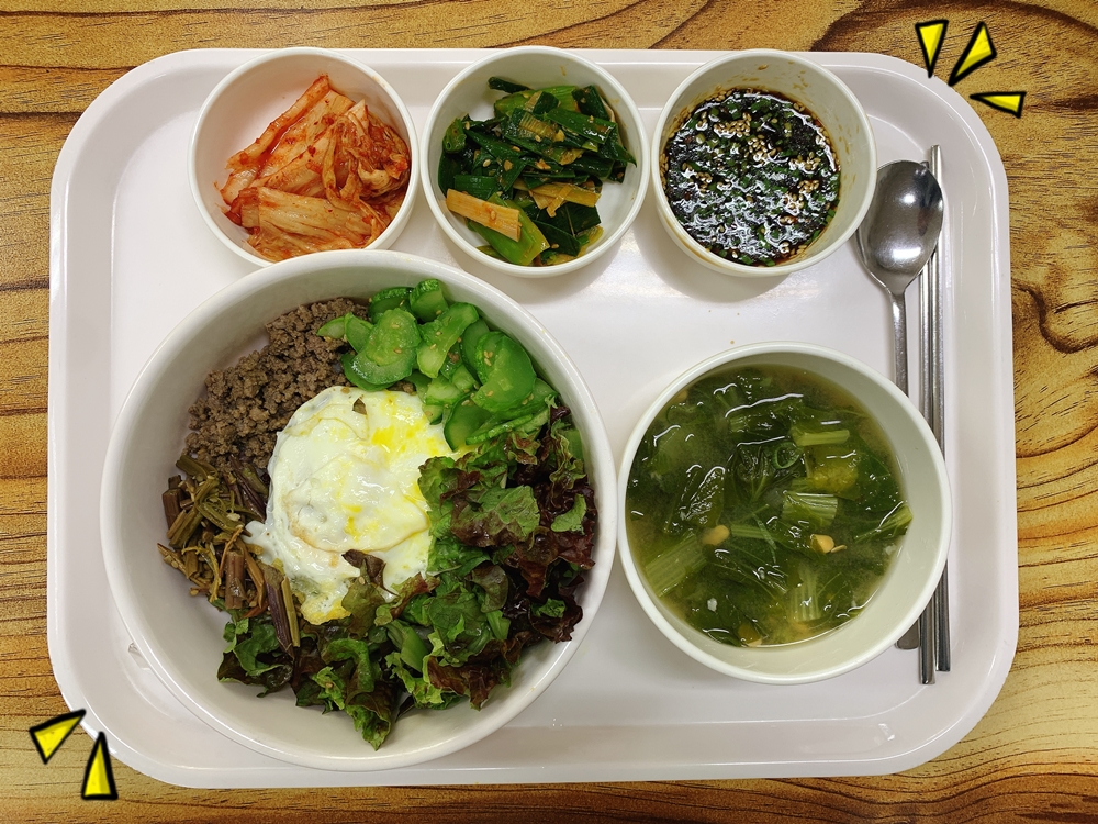 금일 중식 식단은 백미밥(죽/잡곡밥) / 얼갈이된장국 / 상추&오이&고사리 / 우민찌&계란후라이 / 풋마늘고추장무침 / 김치 였습니다~!