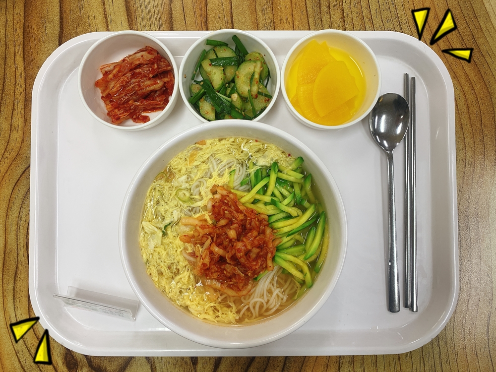 금일 중식 식단은 백미밥(죽/잡곡밥) / 잔치국수 / 애호박&김치&계란 / 오이부추겉절이 / 단무지 / 김치 였습니다~!