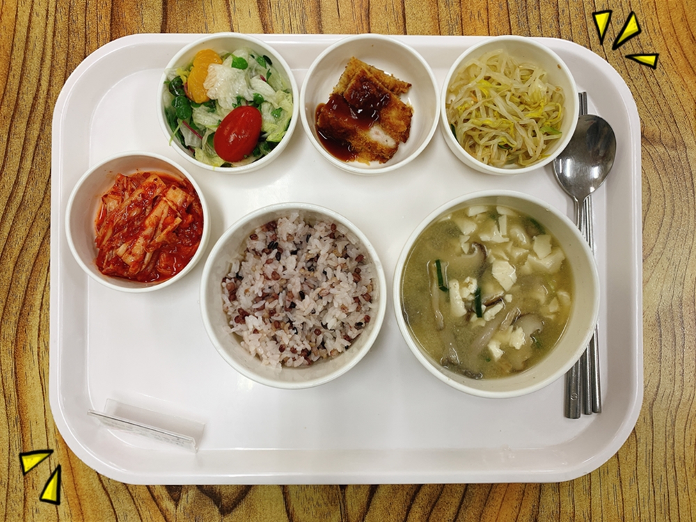 금일 중식 식단은 백미밥(죽/잡곡밥) / 들깨버섯탕 / 돈까스&돈까스소스 / 숙주나물무침 / 양상추과일샐러드 / 김치 였습니다~!