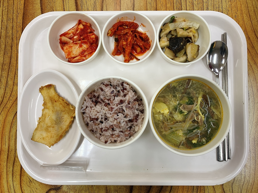 금일 중식 식단은 백미밥(죽/잡곡밥) / 육개장 / 가자미구이 / 표고버섯양파볶음 / 무말랭이무침지 / 김치 였습니다~!