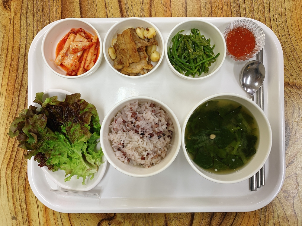 금일 중식 식단은 백미밥(죽/잡곡밥) / 열무된장국 / 삼겹살구이 / 상추쌈&쌈장 / 고구마순들깨지짐 / 김치 였습니다~!