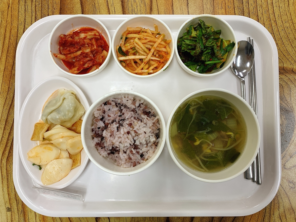 금일 중식 식단은 백미밥(죽/잡곡밥) / 소고기해장국 / 국물떡볶이&교자만두 / 오이상추겉절이 / 무생채 / 김치 였습니다~!