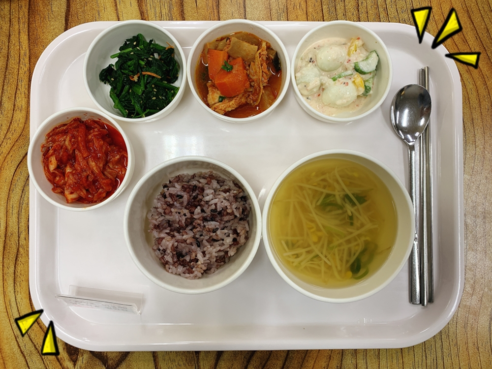 금일 중식 식단은 백미밥(죽/잡곡밥) / 콩나물맑은국 / 버섯닭볶음 / 꽃맛살메추리알샐러드 / 시금치나물 / 김치 였습니다~!