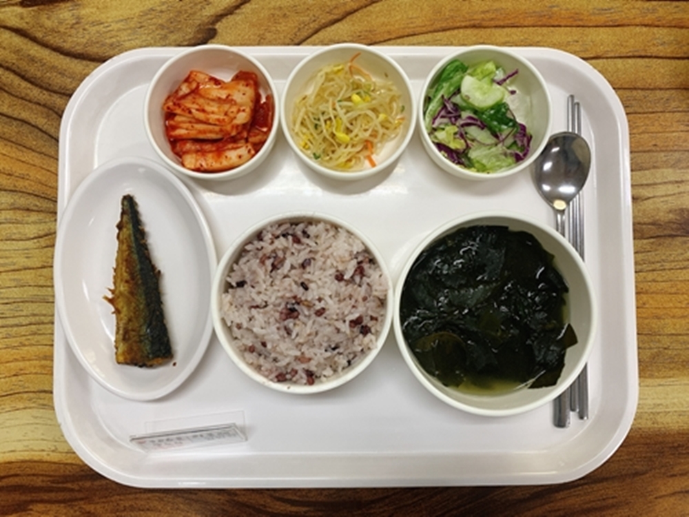 금일 중식 식단은 백미밥(죽/잡곡밥) / 미역국 / 꽁치카레구이 / 콩나물무침 / 야채샐러드 / 김치 였습니다~!
