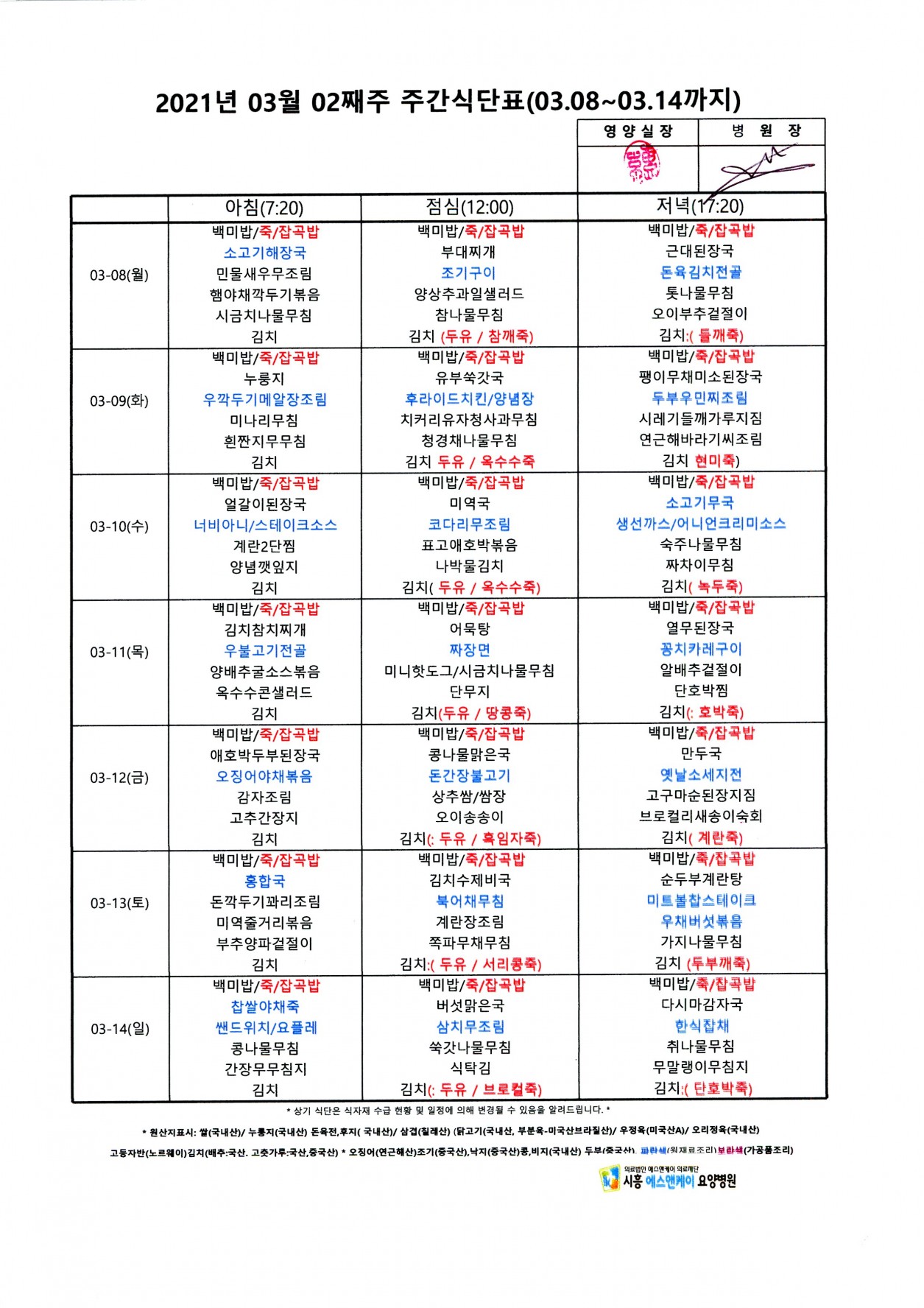 2021년 3월 2째주 주간식단표