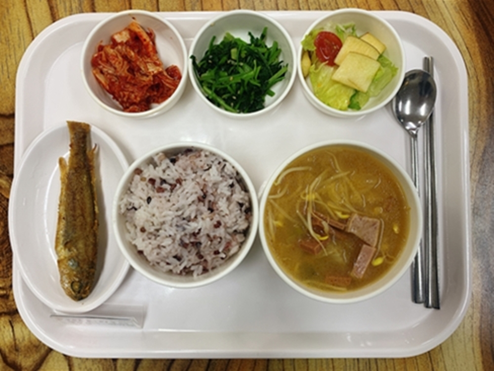 금일 중식 식단은 백미밥(죽/잡곡밥) / 부대찌개 / 조기구이 / 양상추과일샐러드 / 참나물무침 / 김치 였습니다~!