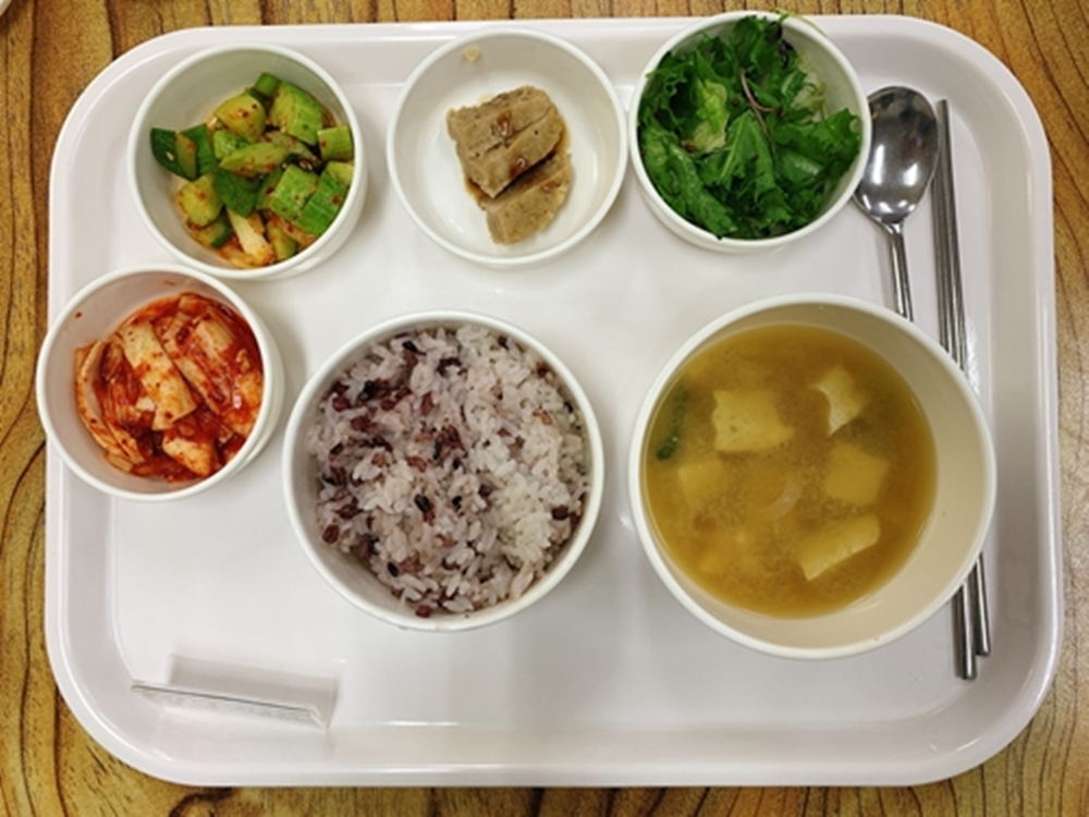 금일 중식 식단은 백미밥(죽/잡곡밥) / 두부된장국 / 함박스테이크&어니언소스 / 야채들깨샐러드 / 오이겉절이 / 김치 였습니다~!