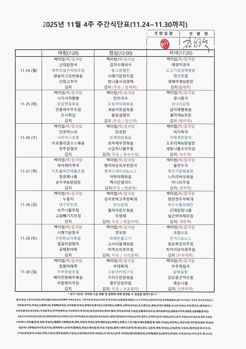 2025년 11월 4째주 주간식단표