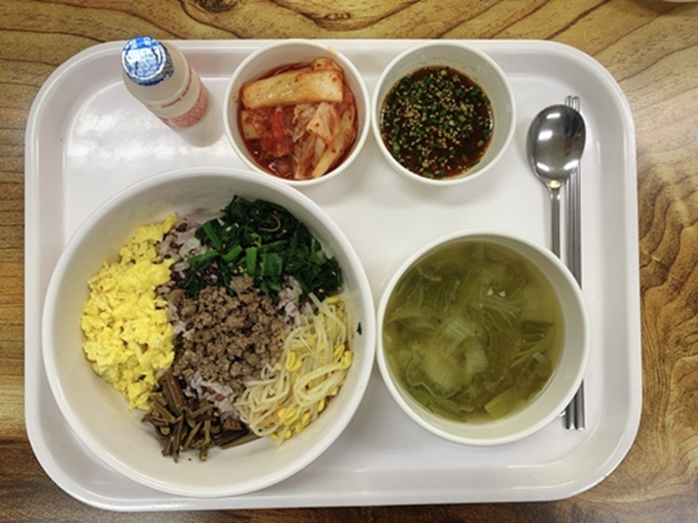 금일 중식 식단은 백미밥(죽/잡곡밥) / 얼갈이된장국 / 콩나물&고사리&우민찌 / 시금치&계란 / 요구르트 / 김치 였습니다~!