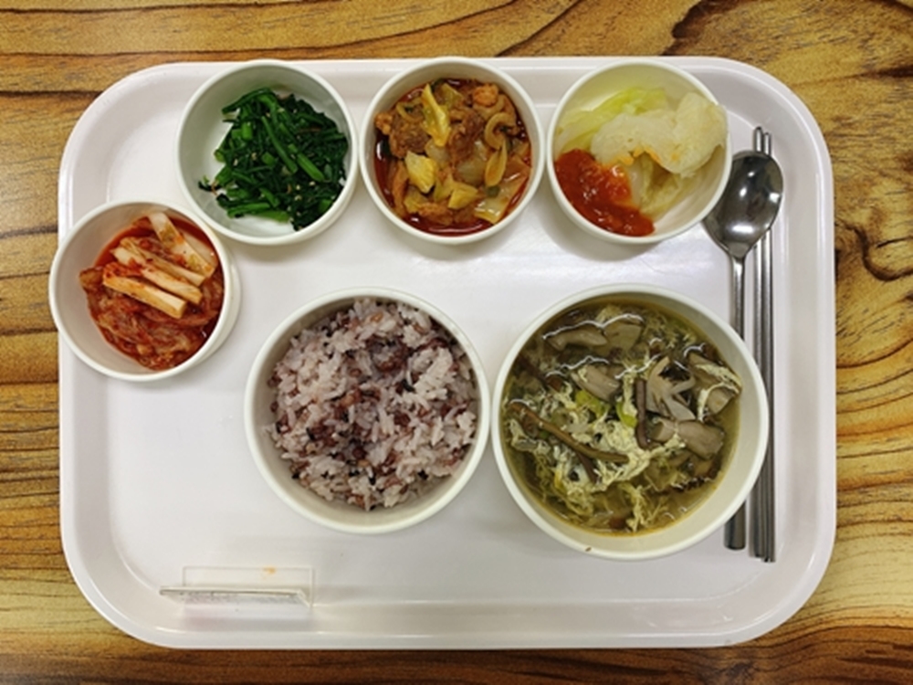 금일 중식 식단은 백미밥(죽/잡곡밥) / 버섯육개장 / 오리주물럭 / 양배추쌈&쌈장 / 쑥갓나물 / 김치 였습니다~!