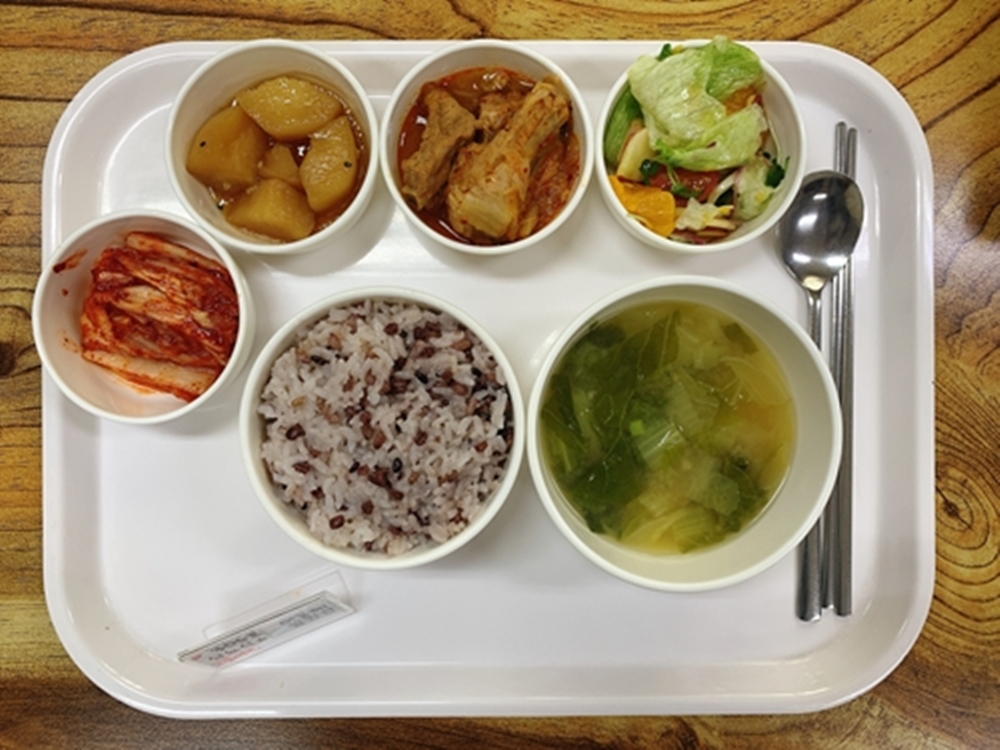 금일 중식 식단은 백미밥(죽/잡곡밥) / 얼갈이된장국 / 돈등갈비김치지짐 / 감자조림 / 양상추과일샐러드 / 김치 였습니다~!
