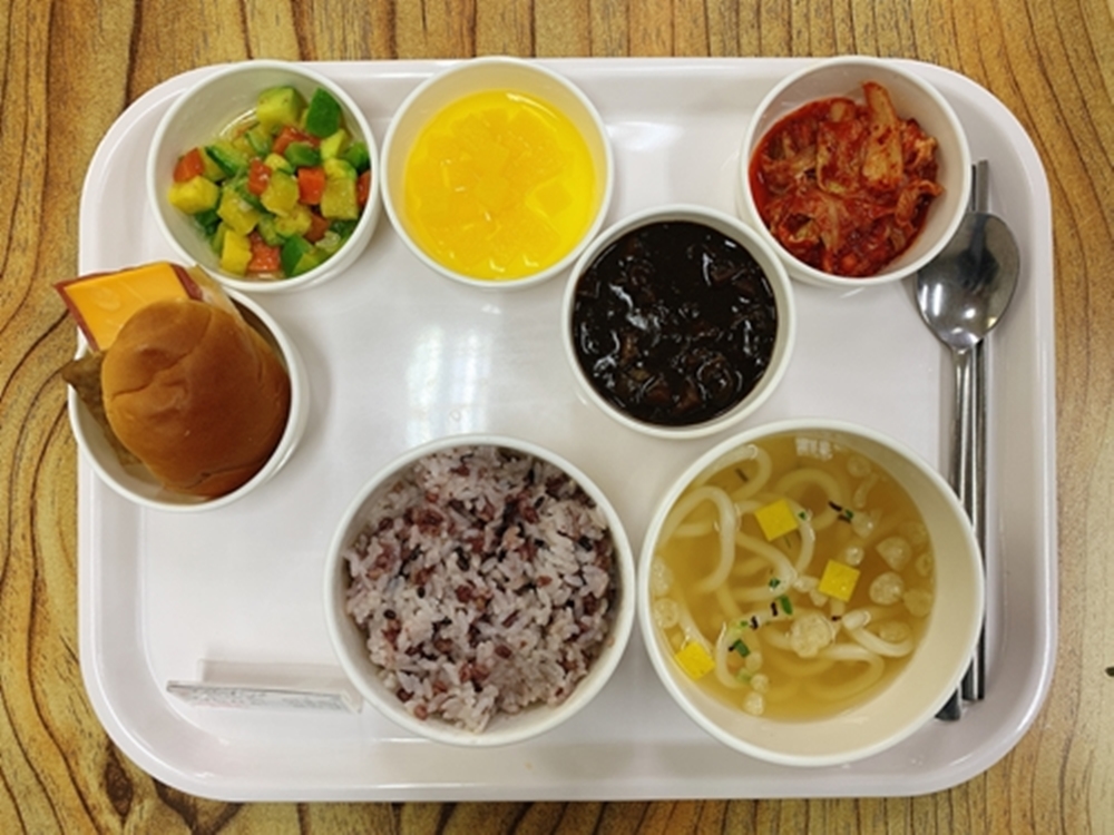 금일 중식 식단은 백미밥(죽/잡곡밥) / 사누끼우동&우동소스 / 미니버거&김밥단무지 / 짜장소스 / 애호박당근깍두기볶음 / 김치 였습니다~!