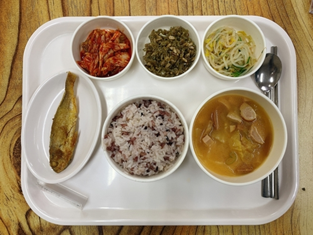 금일 중식 식단은 백미밥(죽/잡곡밥) / 부대찌개 / 조기구이 / 숙주미나리나물무침 / 지리멸치아몬드볶음 / 김치 였습니다~!