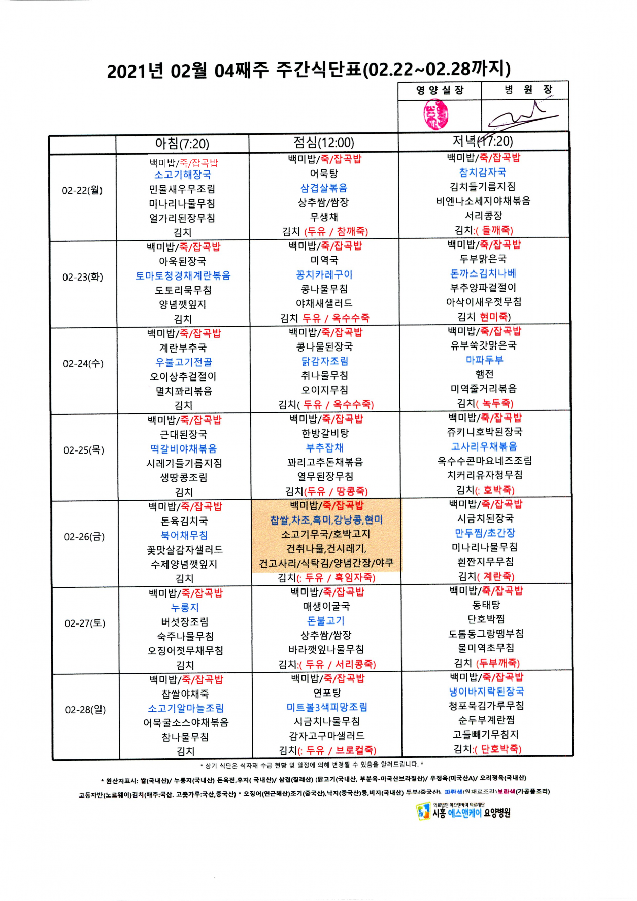 HOME > 병원소식 > 영양식단표