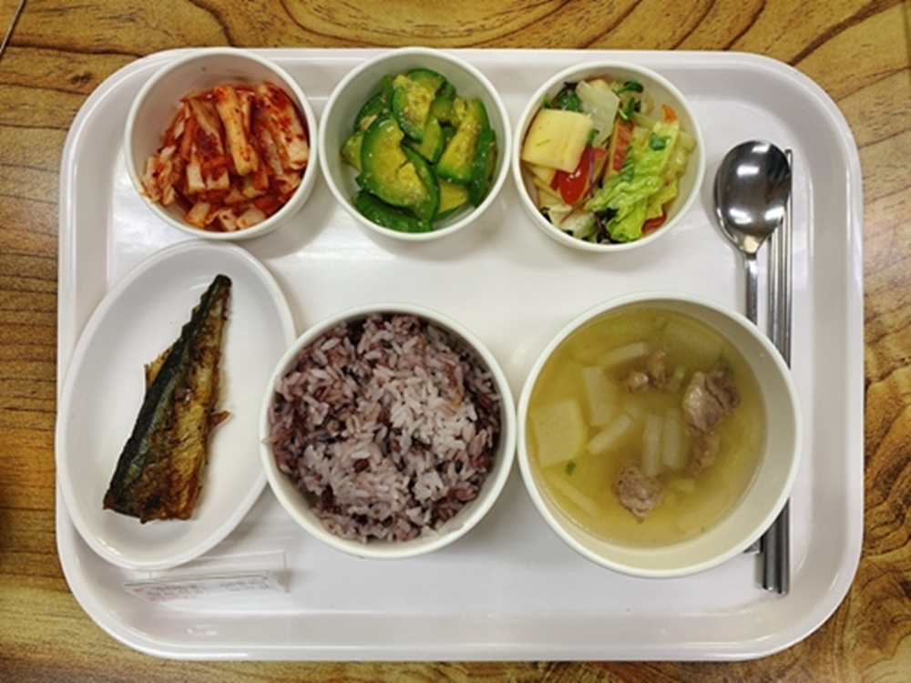 금일 중식 식단은 백미밥(죽/잡곡밥) / 소고기무국 / 꽁치카레구이 / 양상추과일샐러드 / 애호박볶음 / 김치 였습니다~!
