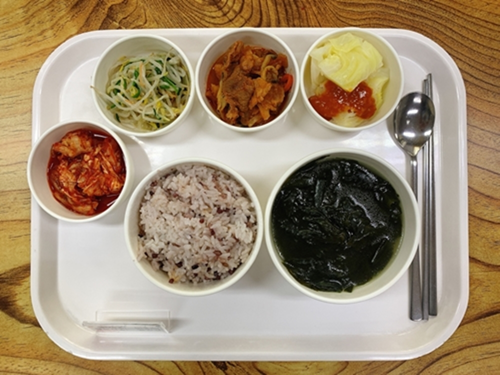 금일 중식 식단은 백미밥(죽/잡곡밥) / 미역국 / 돈불고기 / 양배추쌈&쌈장 / 숙주나물무침 / 김치 였습니다~!