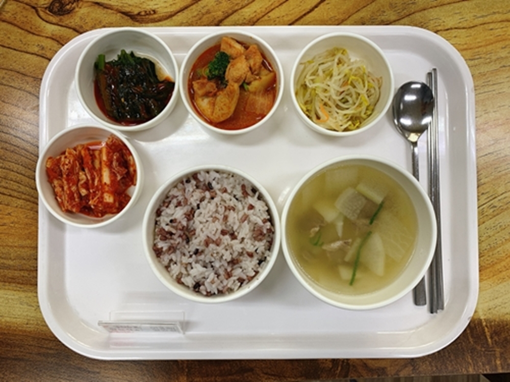 금일 중식 식단은 백미밥(죽/잡곡밥) / 소고기무국 / 닭감자조림 / 물미역초무침 / 숙주나물무침 / 김치 였습니다~!