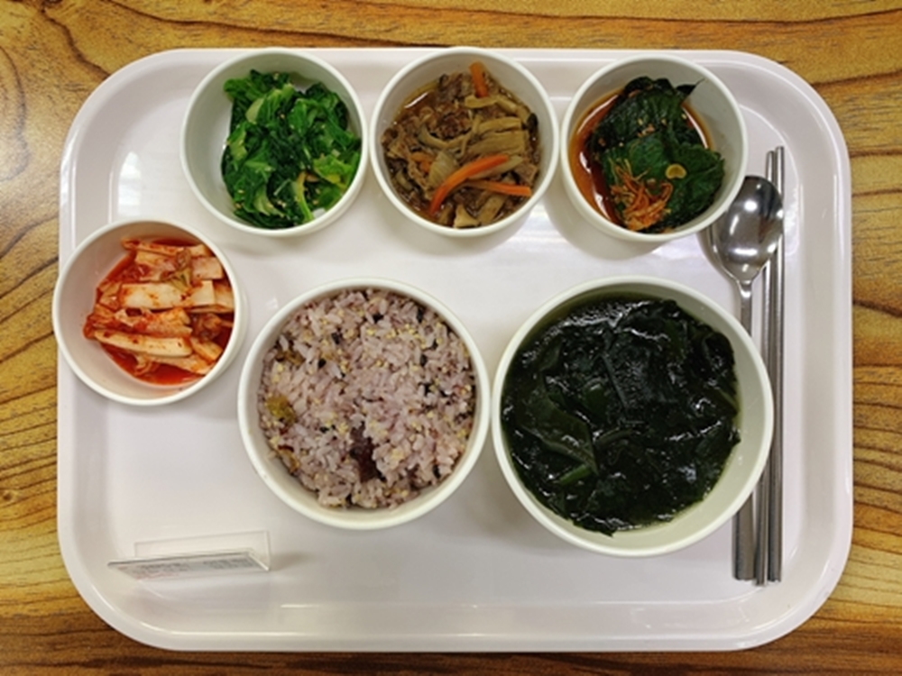 금일 중식 식단은 영양밥(죽/잡곡밥) / 미역국 / 우불고기 / 얼가리된장무침 / 수제깻잎지 / 김치 였습니다~!