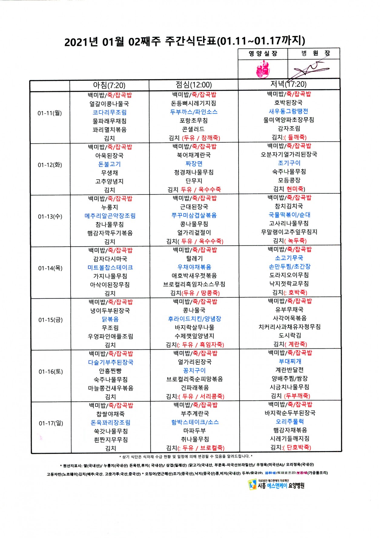 2021년 1월 2째주 주간식단표