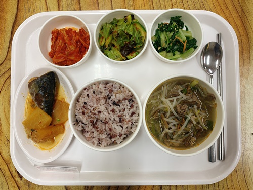 금일 중식 식단은 백미밥(죽/잡곡밥) / 육개장 / 고등어무조림 / 오이상추겉절이 / 청경채된장무침 / 김치 였습니다~!