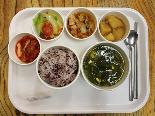 금일 중식 식단은 백미밥(죽/잡곡밥) / 열무콩나물된장국 / 돈육김치지짐 / 과일야채샐러드 / 감자조림 / 김치 였습니다~!