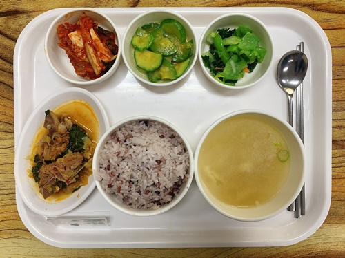 금일 중식 식단은 백미밥(죽/잡곡밥) / 유부된장국 / 돈등뼈김치지짐 / 애호박새우젓볶음 / 청경채나물무침 / 김치 였습니다~!