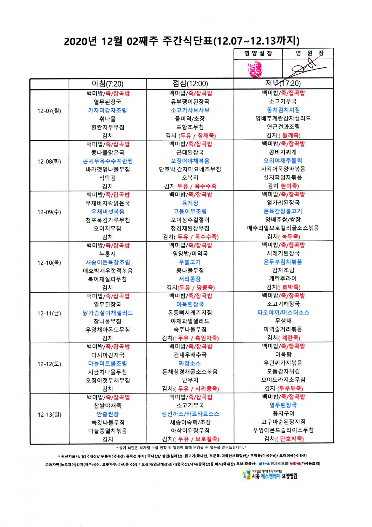 2020년 12월 2째주 주간식단표