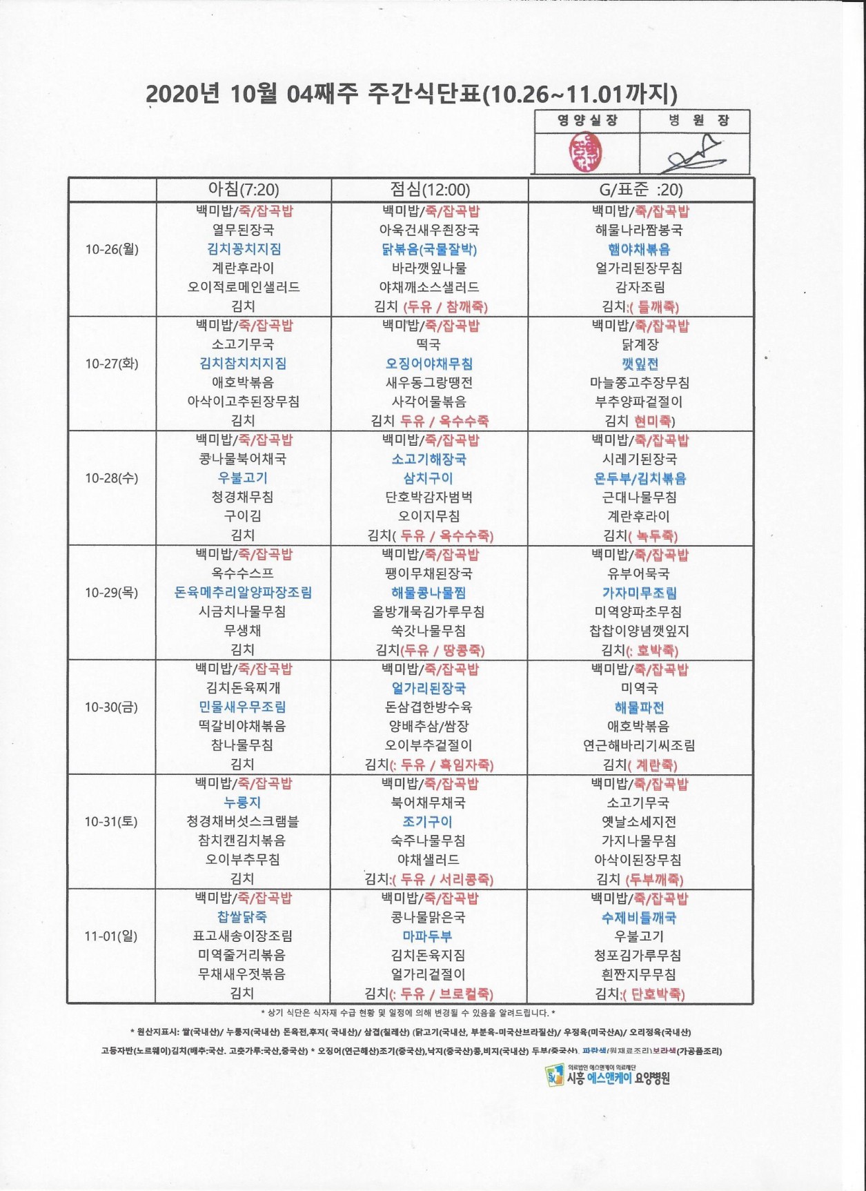 2020년 10월 4째주 주간식단표