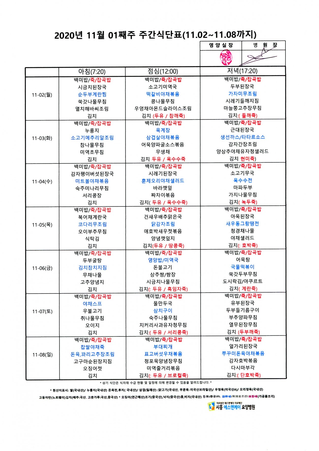 2020년 11월 1째주 주간식단표