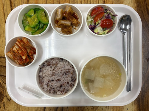 금일 중식 식단은 백미밥(죽/잡곡밥) / 소고기무국 / 돈까스&돈까스소스 / 애호박새우젓볶음 / 야채샐러드 / 김치 였습니다~!