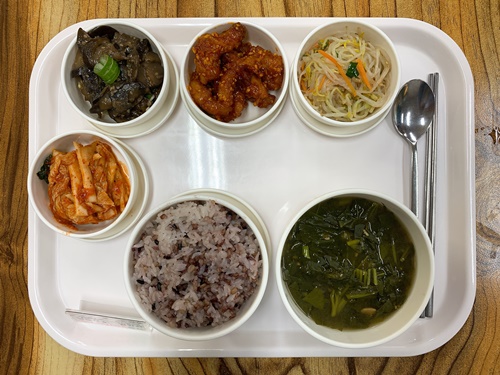 금일 중식 식단은 백미밥(죽/잡곡밥) / 아욱된장국 / 닭강정 / 숙주나물무침 / 가지나물무침 / 김치 였습니다~!