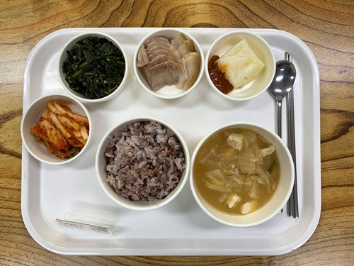 금일 중식 식단은 백미밥(죽/잡곡밥) / 청국장찌개 / 수육&쌈장 / 양배추쌈 / 바라깻잎나물무침 / 김치 였습니다~!