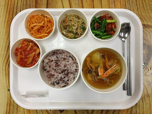 금일 중식 식단은 백미밥(죽/잡곡밥) / 꽃게탕 / 돈채숙주굴소스볶음 / 마늘쫑건새우볶음 / 흰짠지무무침 / 김치 였습니다~!
