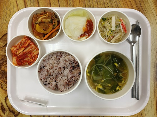 금일 중식 식단은 백미밥(죽/잡곡밥) / 얼가리된장국 / 돈불고기 / 양배추쌈&쌈장 / 숙주나물맛살무침 / 김치 였습니다~!