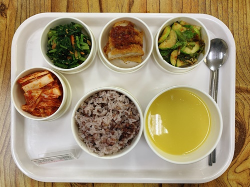 금일 중식 식단은 백미밥(죽/잡곡밥) / 옥수수스프 / 돈까스&돈까스소스 / 열무된장무침 / 오이상추겉절이 / 김치 였습니다~!