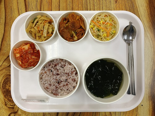 금일 중식 식단은 백미밥(죽/잡곡밥) / 미역국 / 돈불고기 / 사각어묵소스볶음 / 콩나물무침 / 김치 였습니다~!