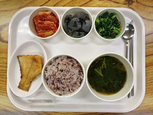 금일 중식 식단은 백미밥(죽/잡곡밥) / 아욱두부된장국 / 가자미구이 / 올방개김가루무침 / 얼가리나물무침 / 김치 였습니다~!