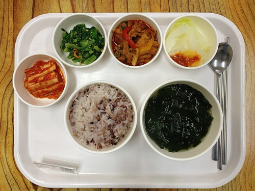금일 중식 식단은 백미밥(죽/잡곡밥) / 미역국 / 돈불고기 / 양배추찜&쌈장 / 얼가리된장무침 / 김치 였습니다~!