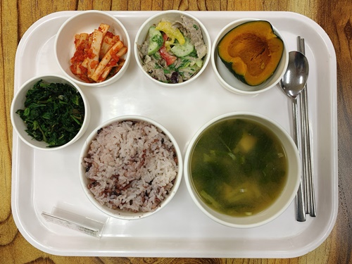 금일 중식 식단은 백미밥(죽/잡곡밥) / 열무된장국 / 차돌야채샐러드 / 단호박찜 / 바라깻잎나물무침 / 김치 였습니다~!