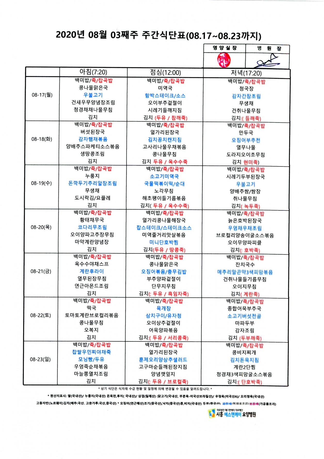 2020년 8월 3째주 주간식단표