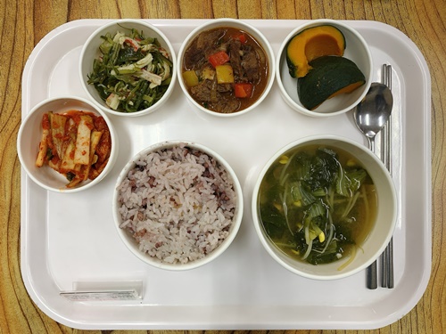 금일 중식 식단은 백미밥(죽/잡곡밥) / 얼가리콩나물해장국 / 찹스테이크&스테이크소스 / 미역줄거리맛살볶음 / 미니단호박찜 / 김치 였습니다~!