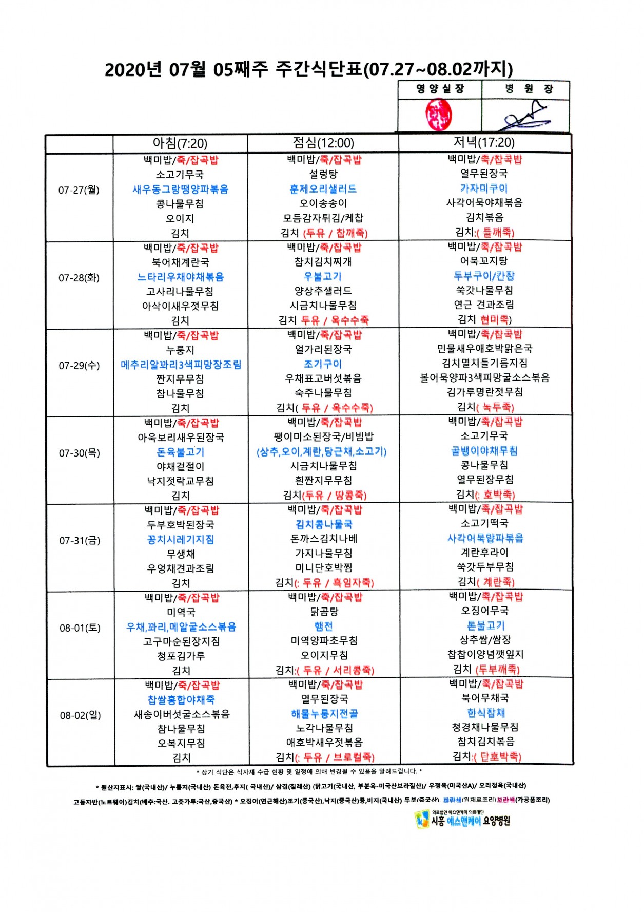 2020년 7월 5째주 주간식단표