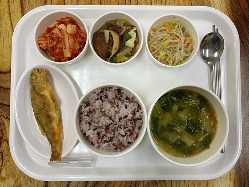 금일 중식 식단은 백미밥(죽/잡곡밥) / 얼가리된장국 / 조기구이 / 우채표고버섯볶음 / 숙주나물무침 / 김치 였습니다~!